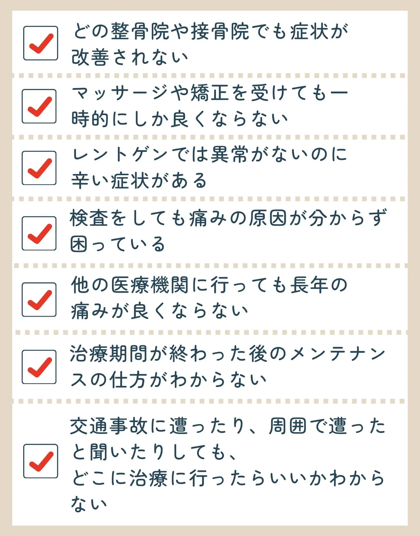 肩こりや腰痛などの慢性的な不調から、ぎっくり腰等の急性の不調まで、