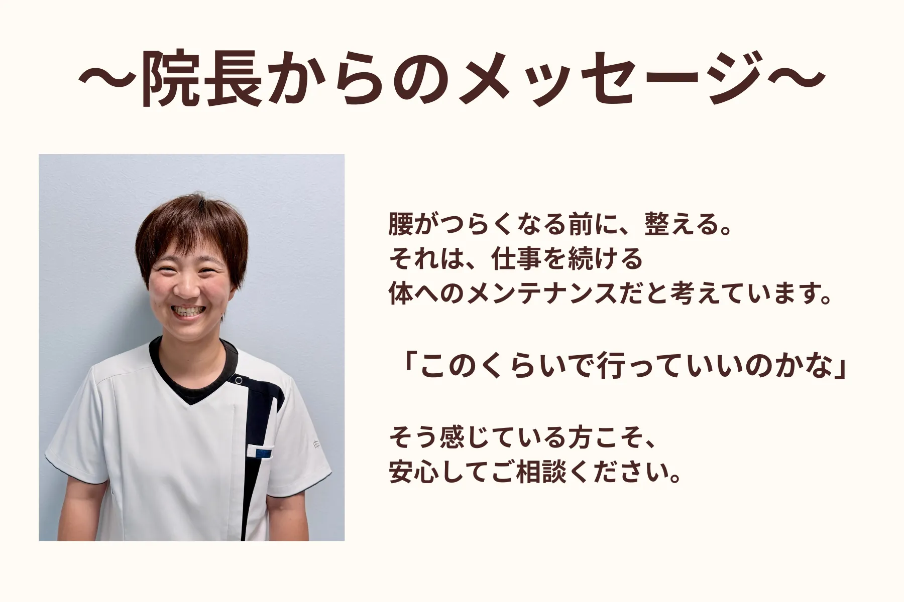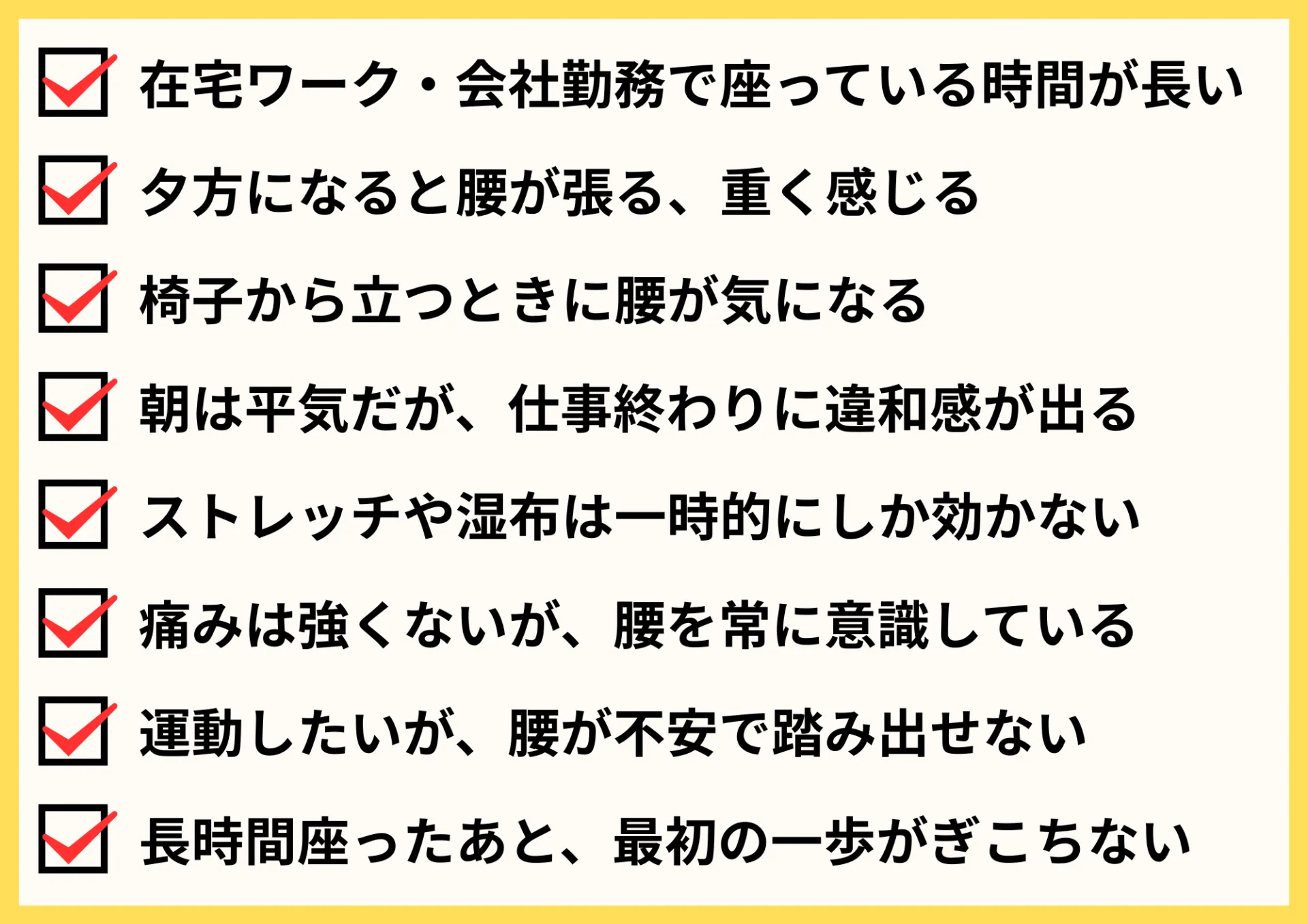 こうした “軽いけれど気になる腰の不調” を抱えた方が多く来院されています。